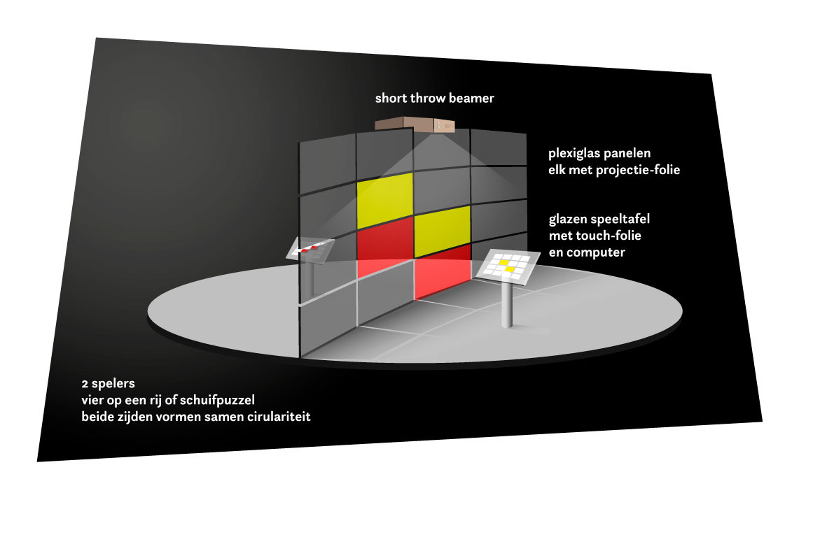 Twee spelers staan tegenover een grid van schermen. Ze houden hun hand bij een kolom en er valt een fiche digitaal naar beneden. Omdat het digitale scherm ook nog eens doorzichtig is ziet de speler aan de andere kant dat vier op een rij begonnen is en houdt daarop zijn hand bij een andere kolom. Sensoren registreren waar je hand zich bevindt en laat aan de hand daarvan een fiche vallen.