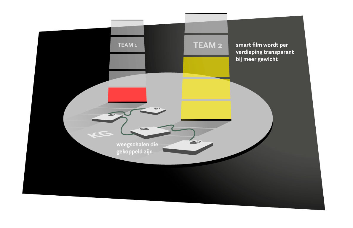 Gewicht is een belangrijke factor in de liftbouw en speelt een belangrijke rol betreffende duurzaamheid, energiebesparing en circulariteit. Door bezoekers op weegschalen te laten staan schakelen we de lift (gebouwd uit smartfilm) naar boven. Heb je vijf mensen op de weegschaal, dan haal je de top. Het is een moderne soort kop van jut. Door hier twee opstellingen van te maken kun je dit ook tegen elkaar spelen. De eerste groep die vijf weegschalen weet te ‘bezetten’ wint en heeft de lift als eerste voor hun neus, want een volle lift is meer gewicht en kost dus minder energie.