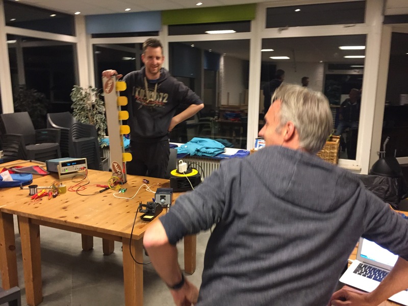 Bevestiging van de Tilt-sensors aan het scroreboard en detail van de werkende Tilt-sensors die een puls doorsturen naar de Arduino en het LoRa Netwerk.