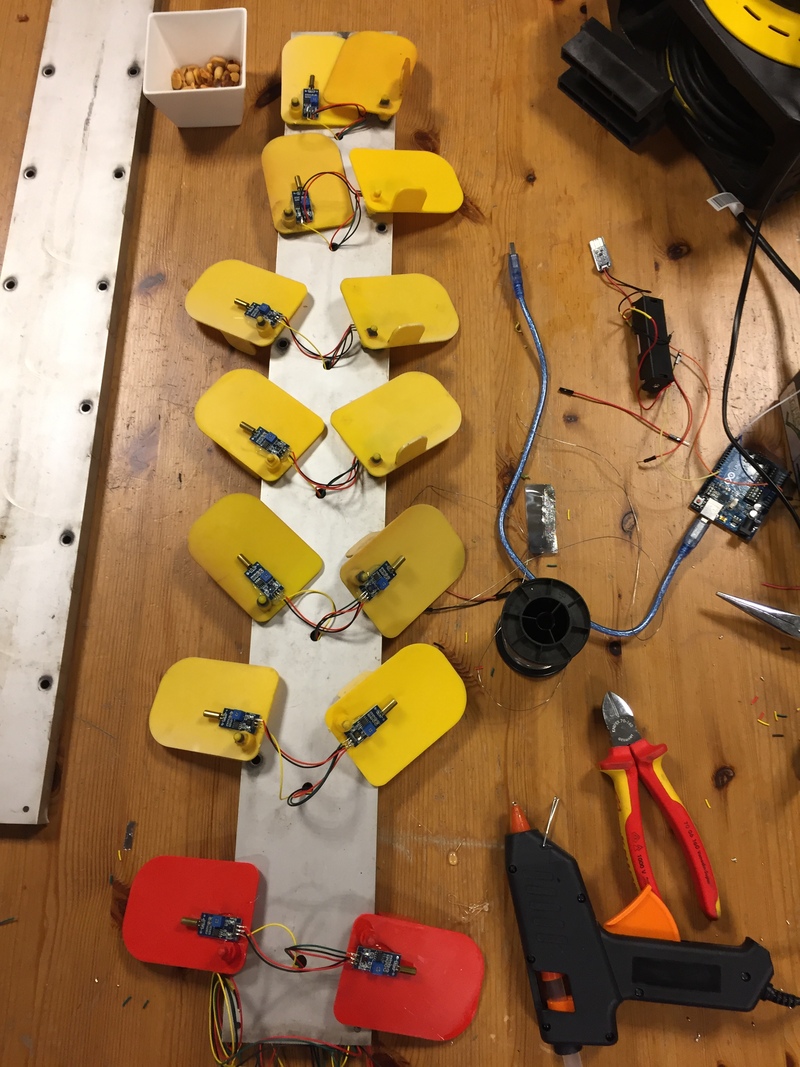 De basis voor het scoreboard: De LoRa module met 10 Tilt-sensors. Zodra een er een punt gemaakt is, klapt een bordje met Tilt-sensor om en stuurt de Arduino een radio-signaal naar een LoRa Gateway. Deze registreert het punt op een webpagina, waardoor je via internet de score kan zien.