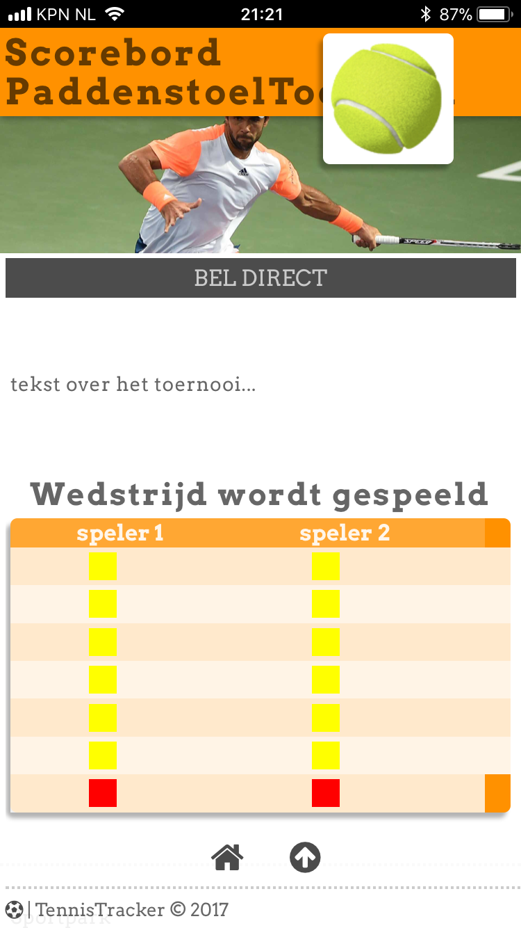 Rechts: Voorbeeld van de webpagina waarop de score is te zien. De gele en rode blokjes komen overeen met de gele en rode bordjes op het scoreboard.